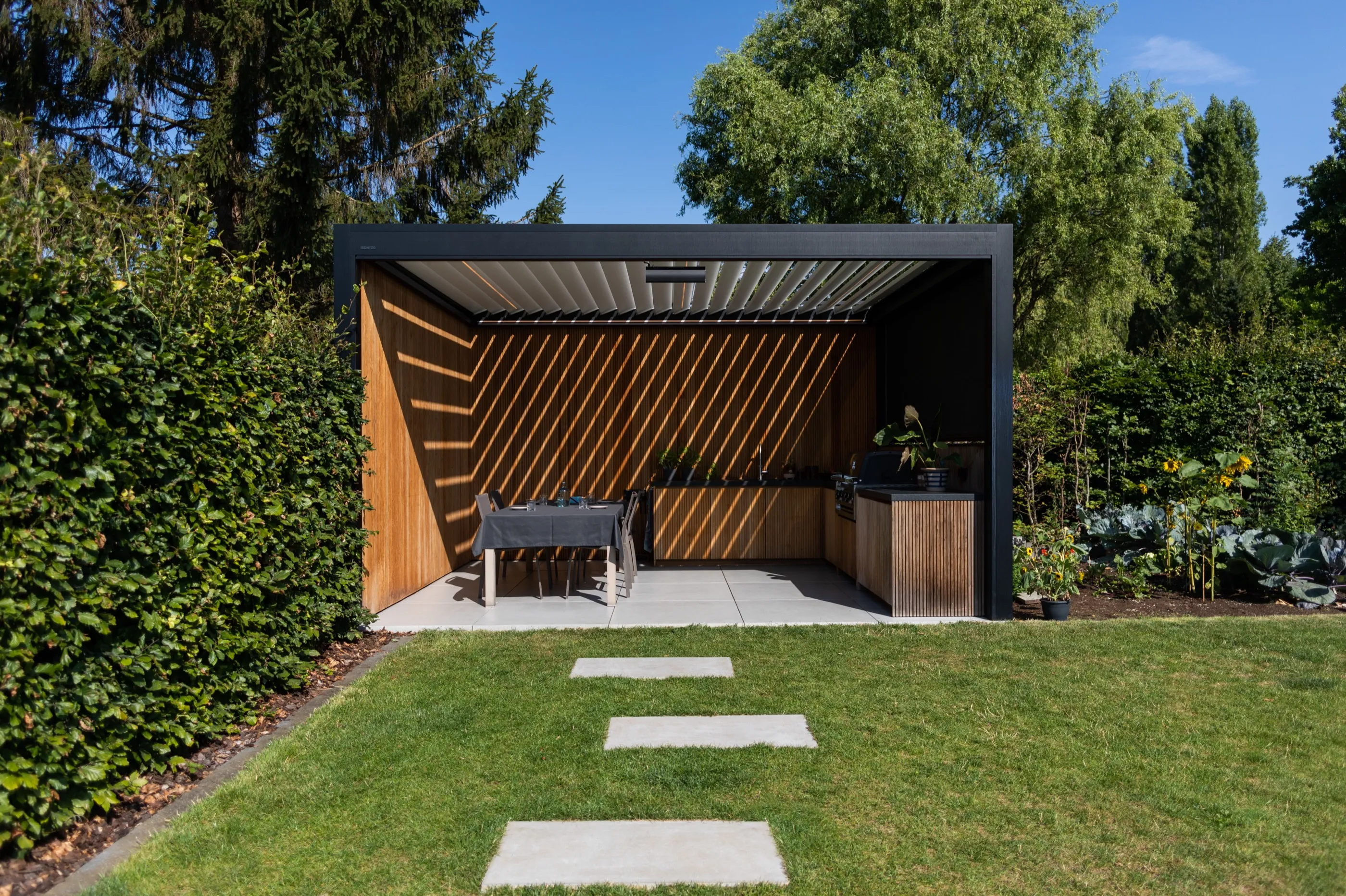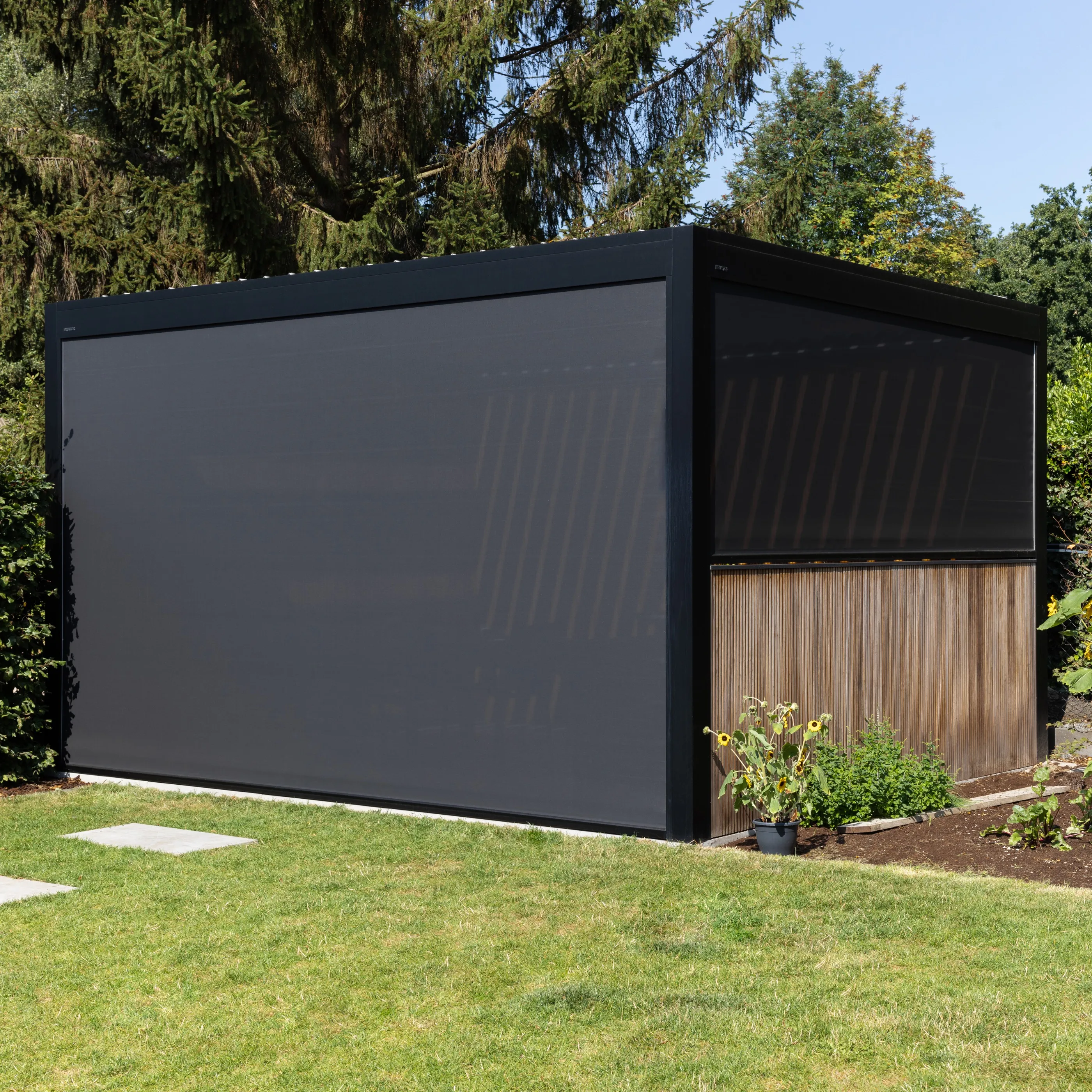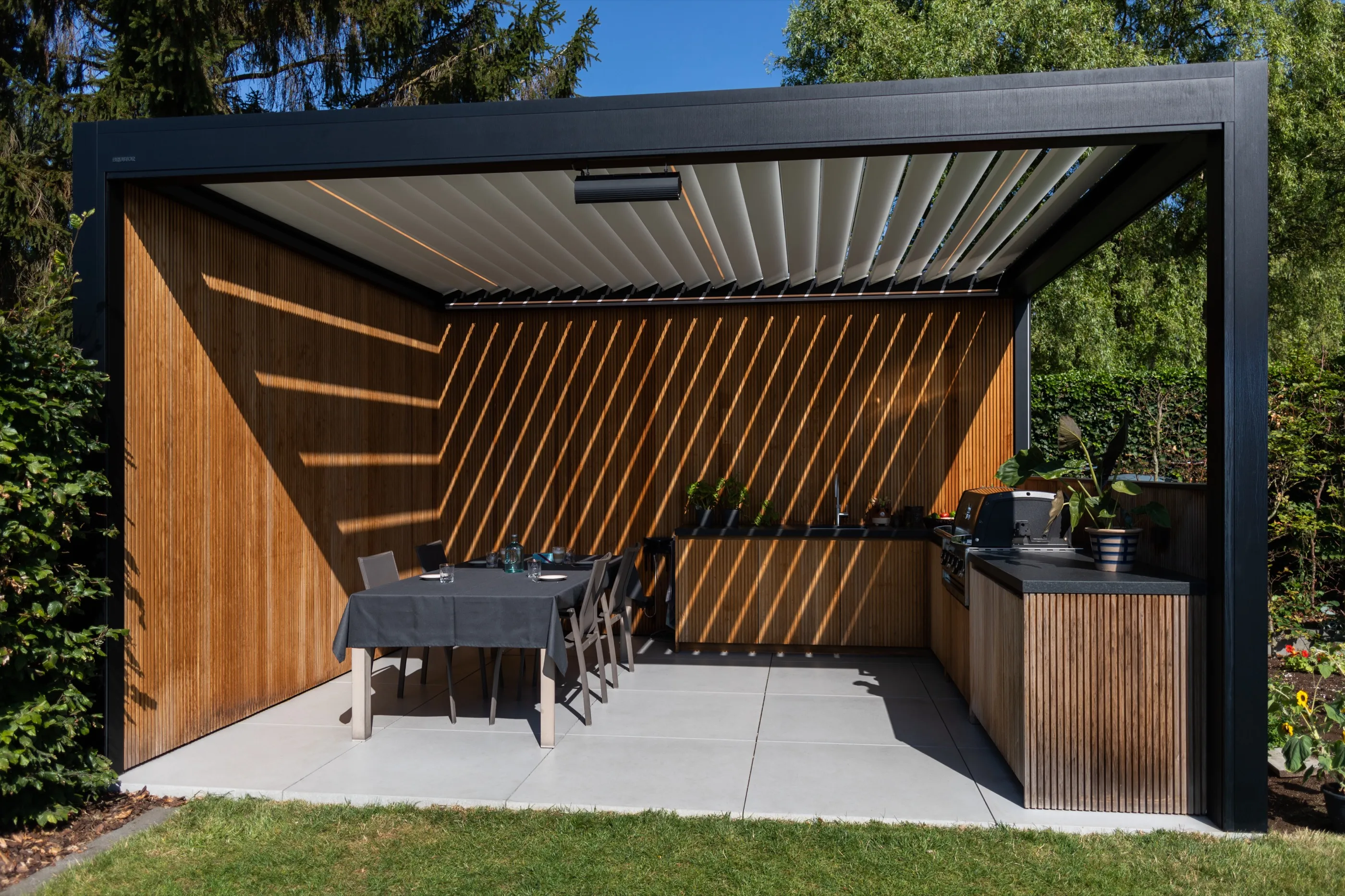 Großflächige Terrassenüberdachung mit dem leistungsstärksten Lamellensystem — klare Linien und maximale Spannweite für architektonischen Anspruch.