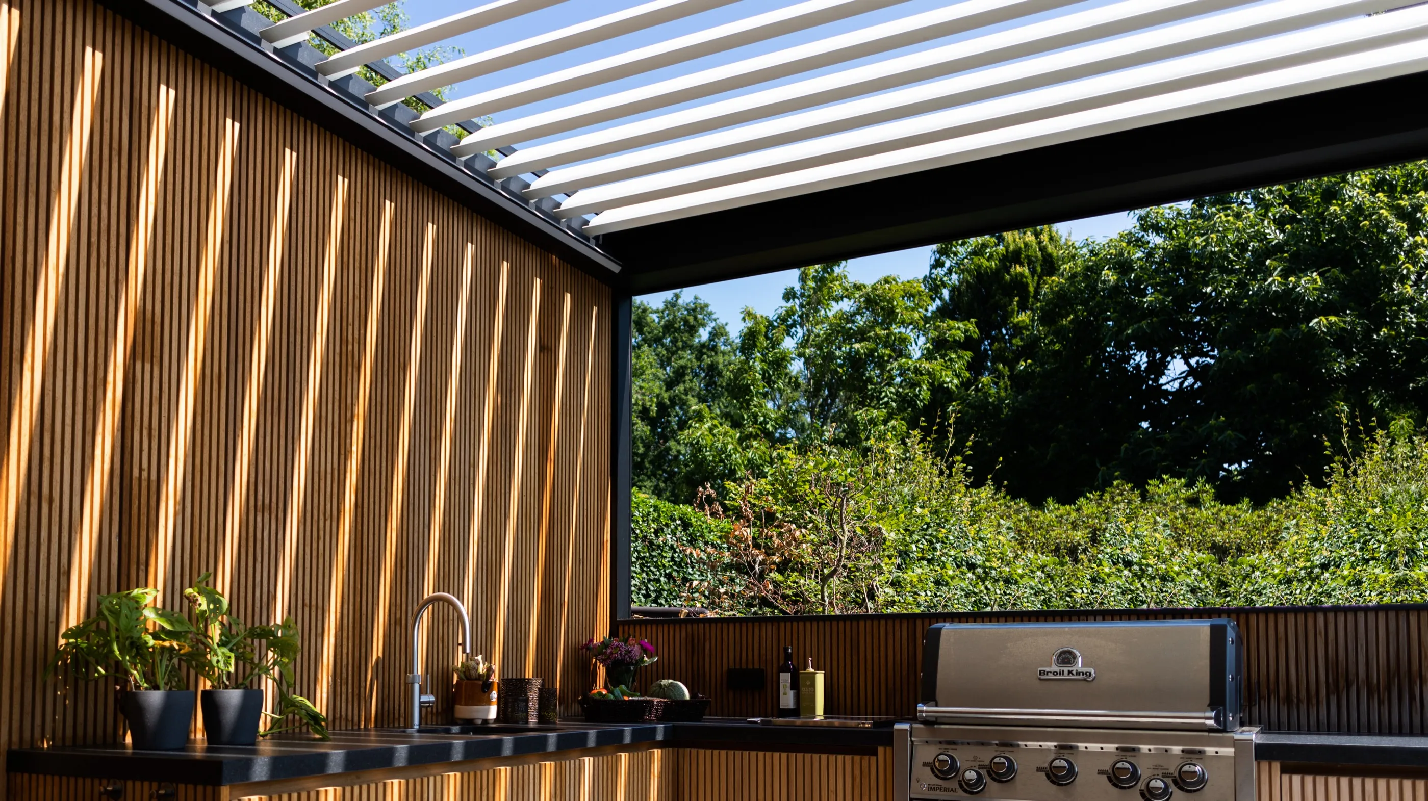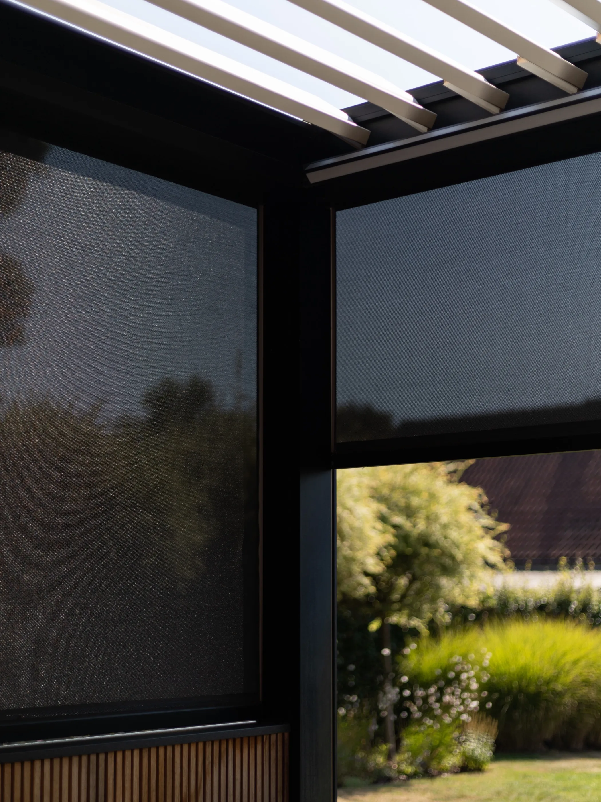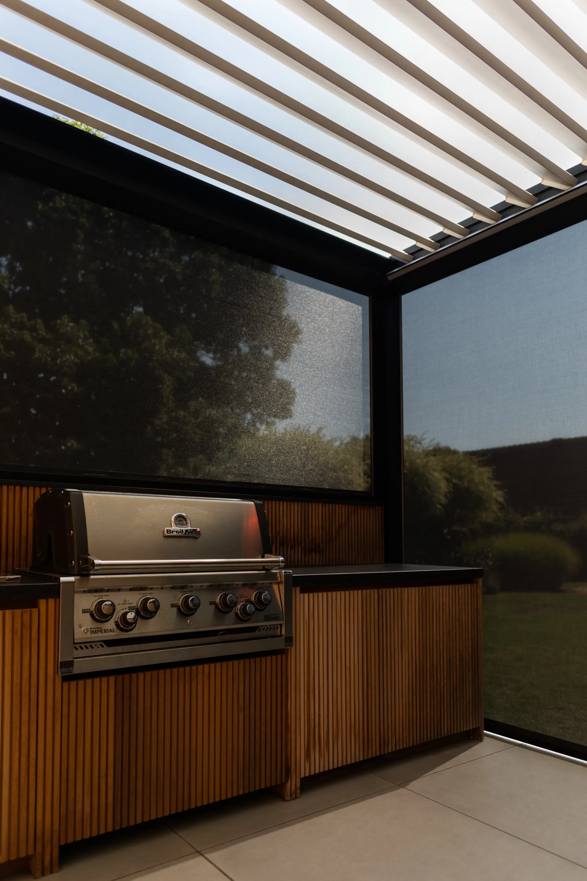 Großflächige Terrassenüberdachung mit dem leistungsstärksten Lamellensystem — klare Linien und maximale Spannweite für architektonischen Anspruch.