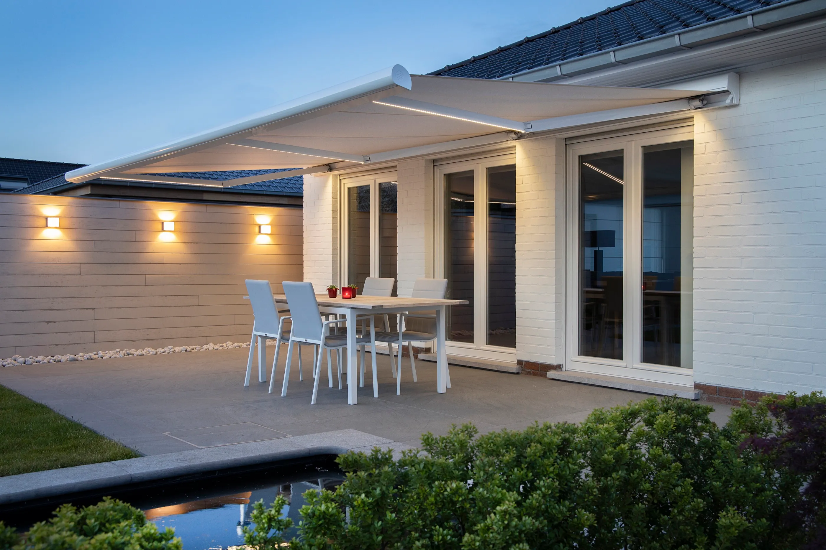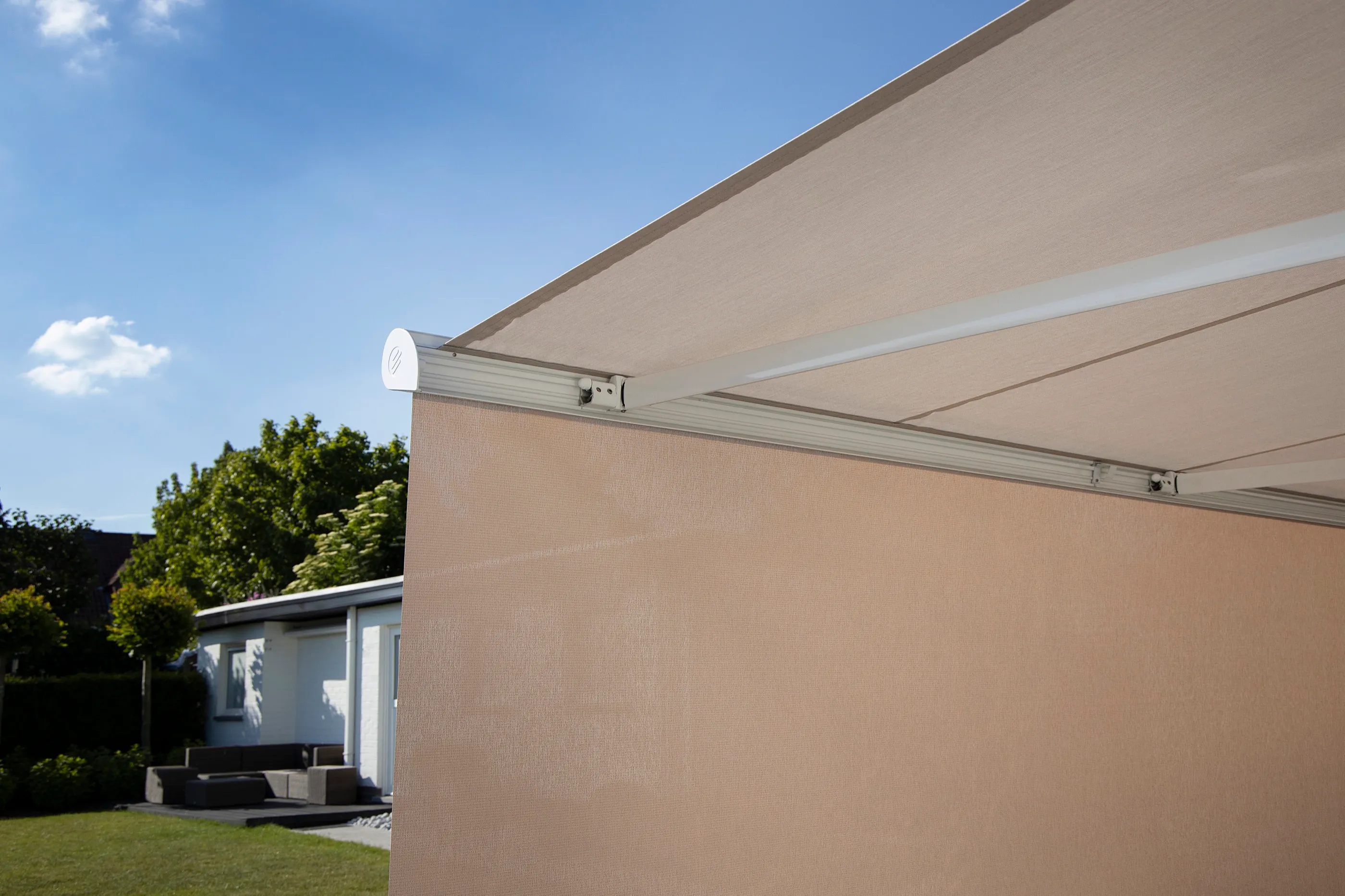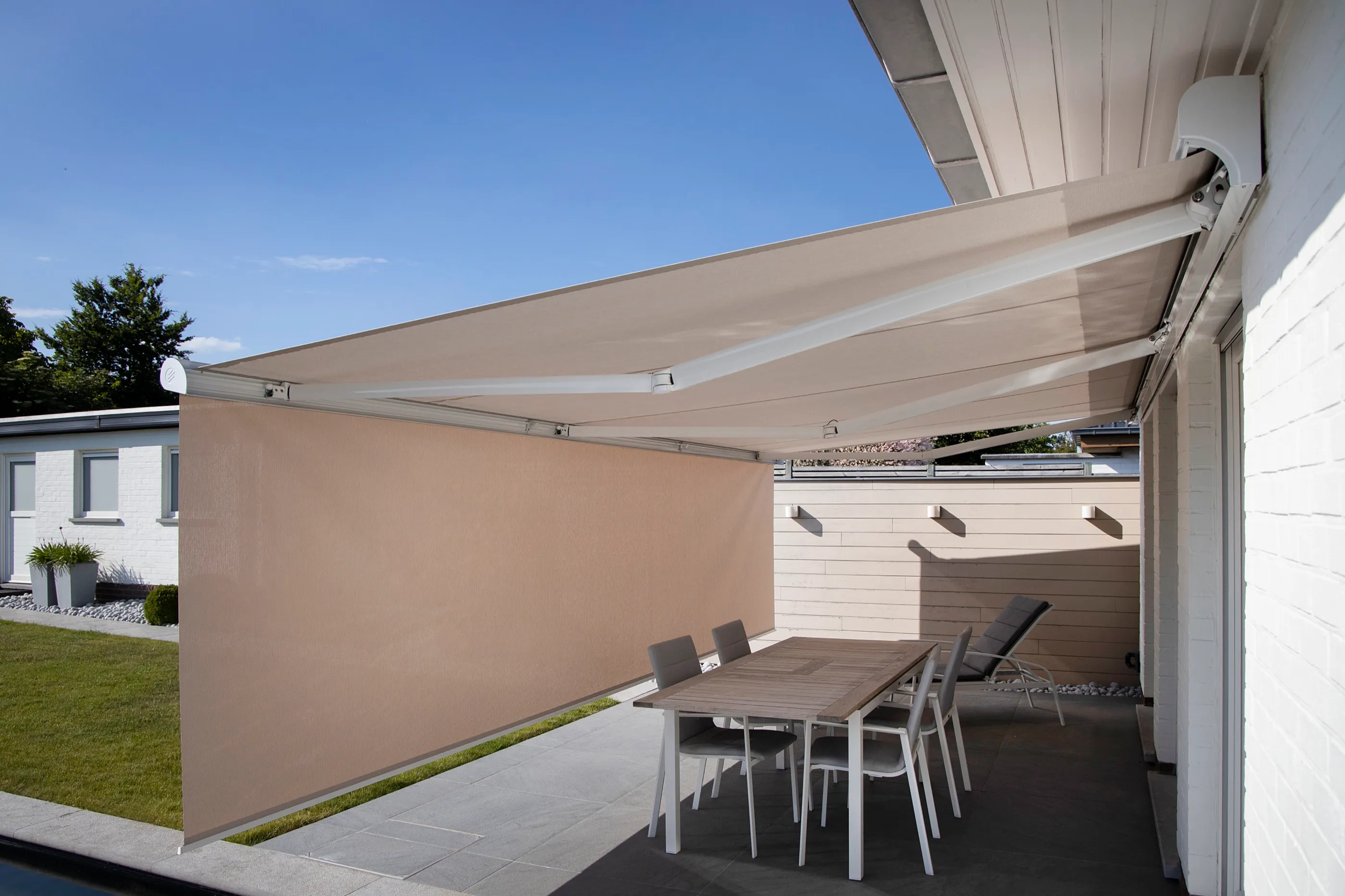Markise mit Volant-Abschluss für eine familienfreundliche Terrasse — robust, pflegeleicht und per Fernbedienung steuerbar.