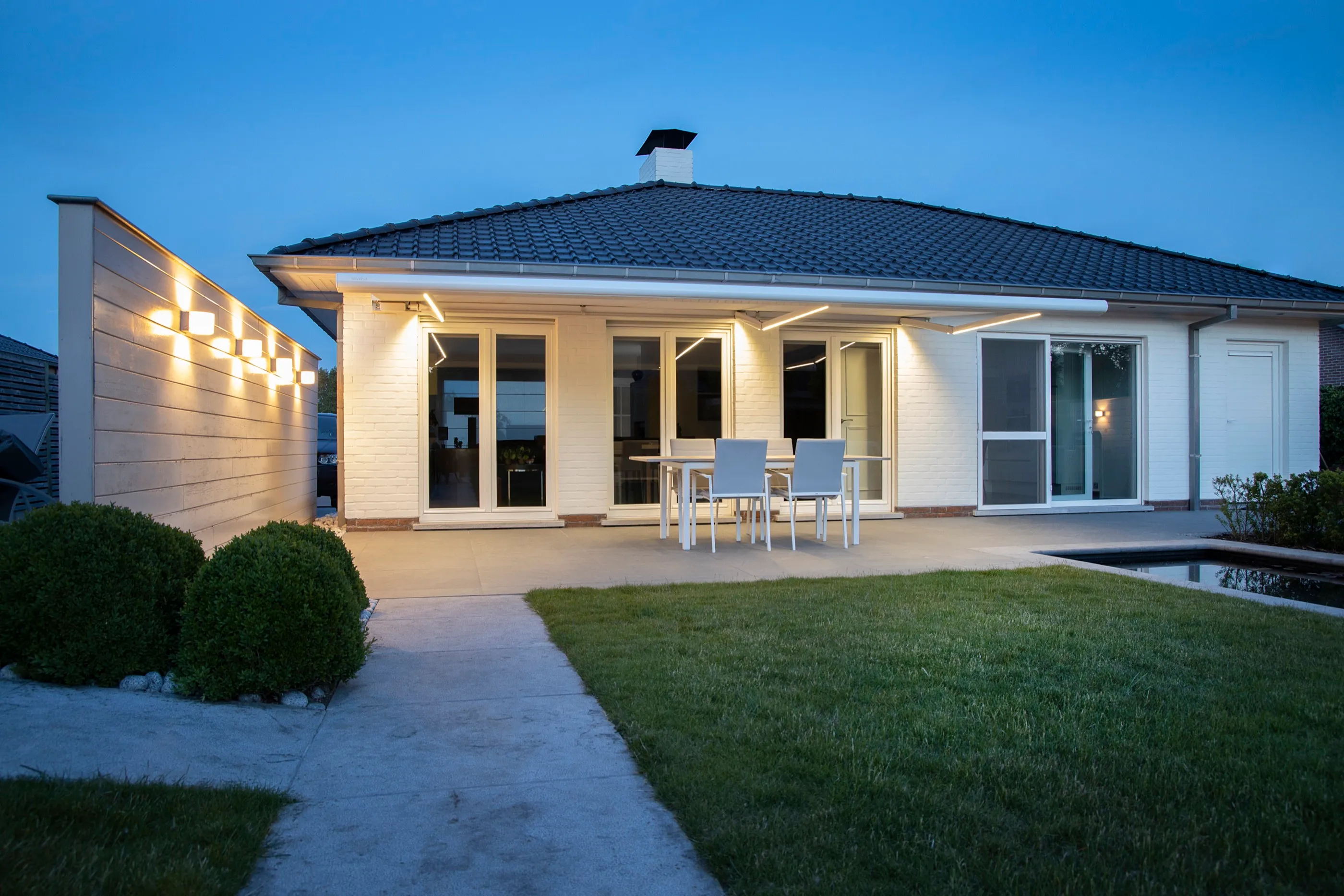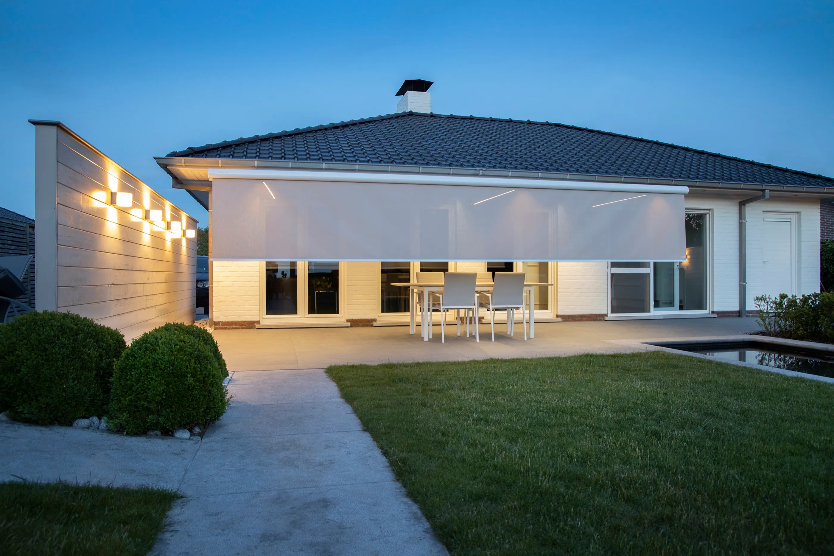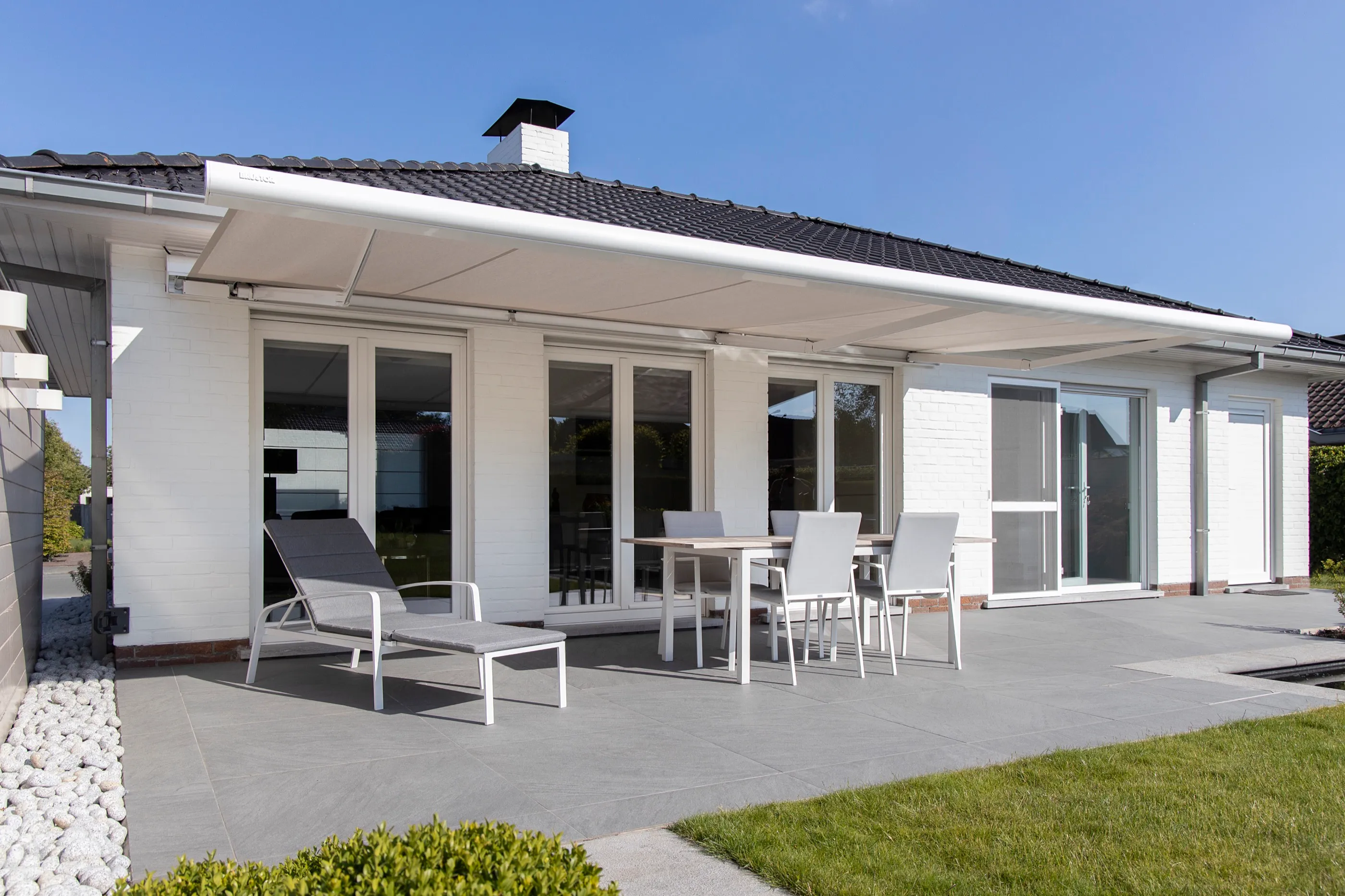 Markise mit Volant-Abschluss für eine familienfreundliche Terrasse — robust, pflegeleicht und per Fernbedienung steuerbar.