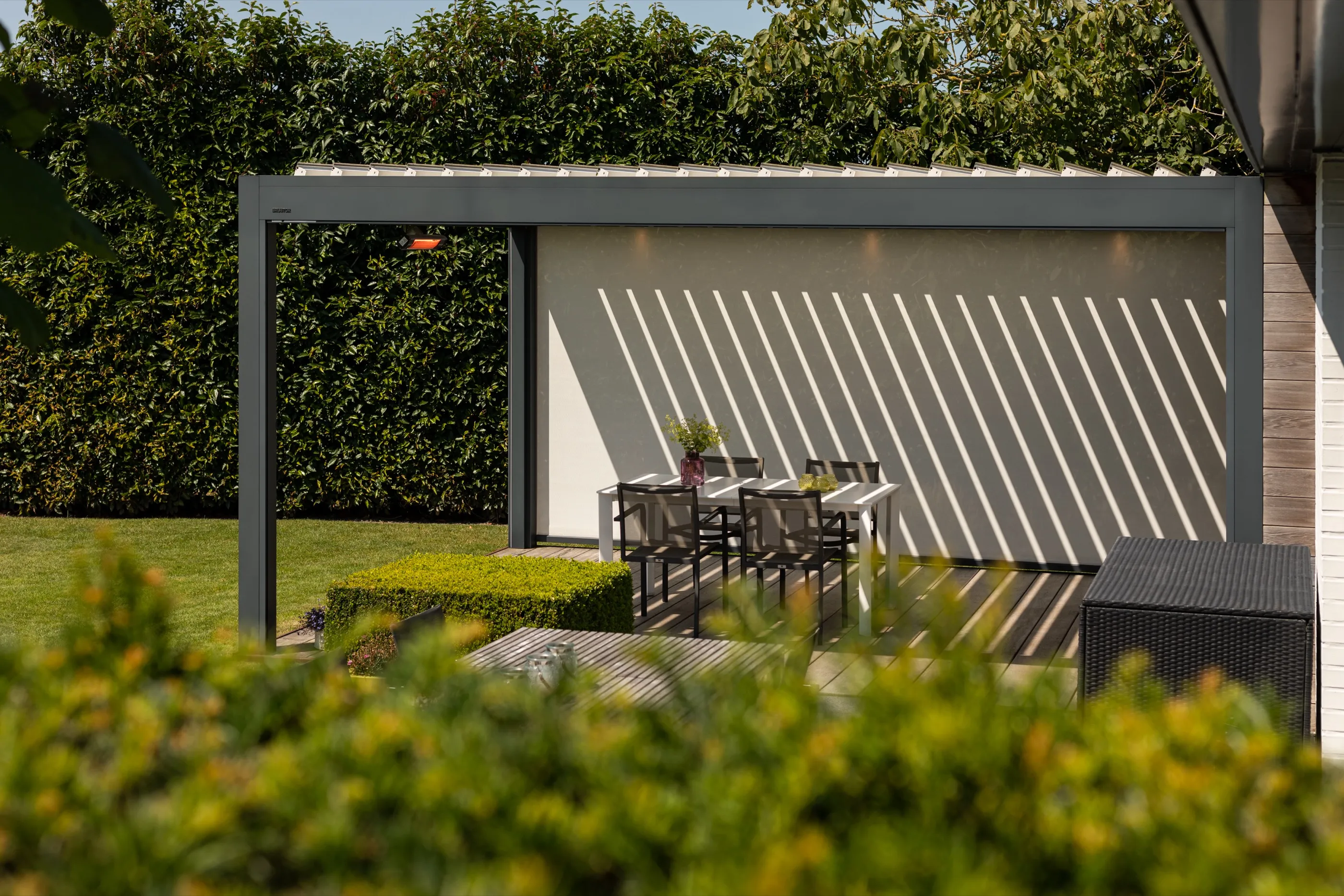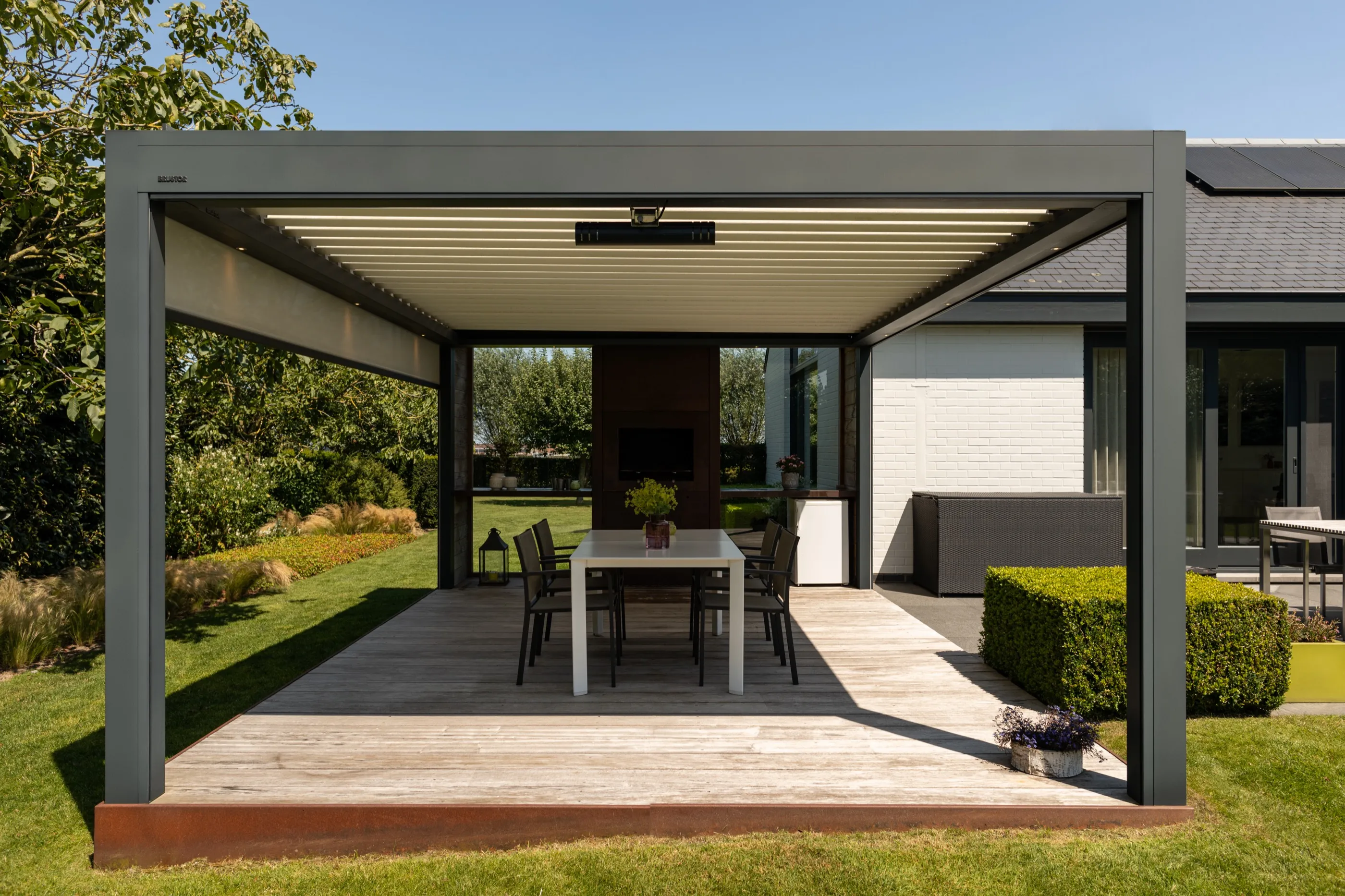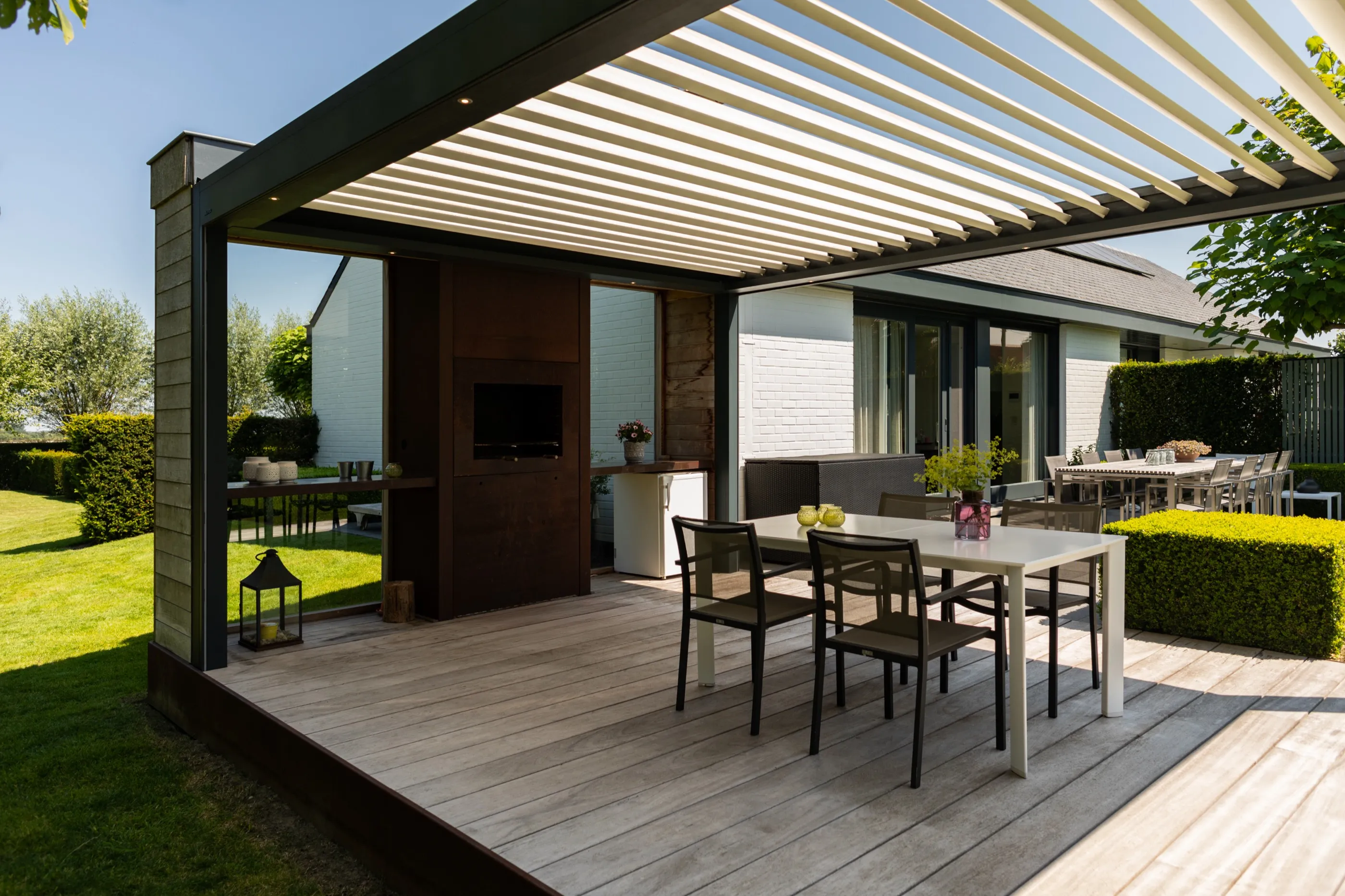Großzügiges Lamellendach für eine weitläufige Terrasse mit Blick ins Grüne — maßgefertigt und nahtlos integriert in die moderne Architektur des Wohnhauses.