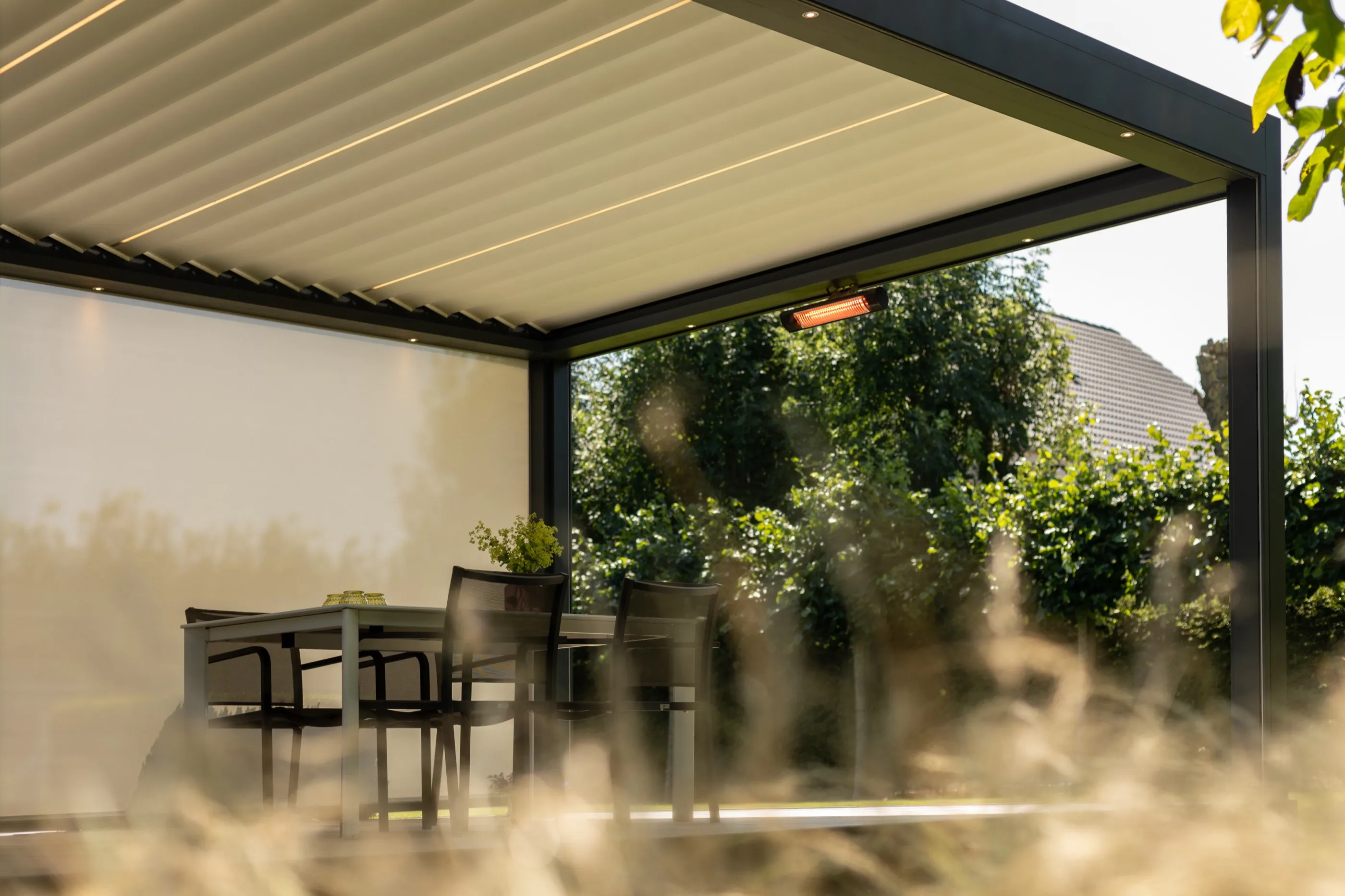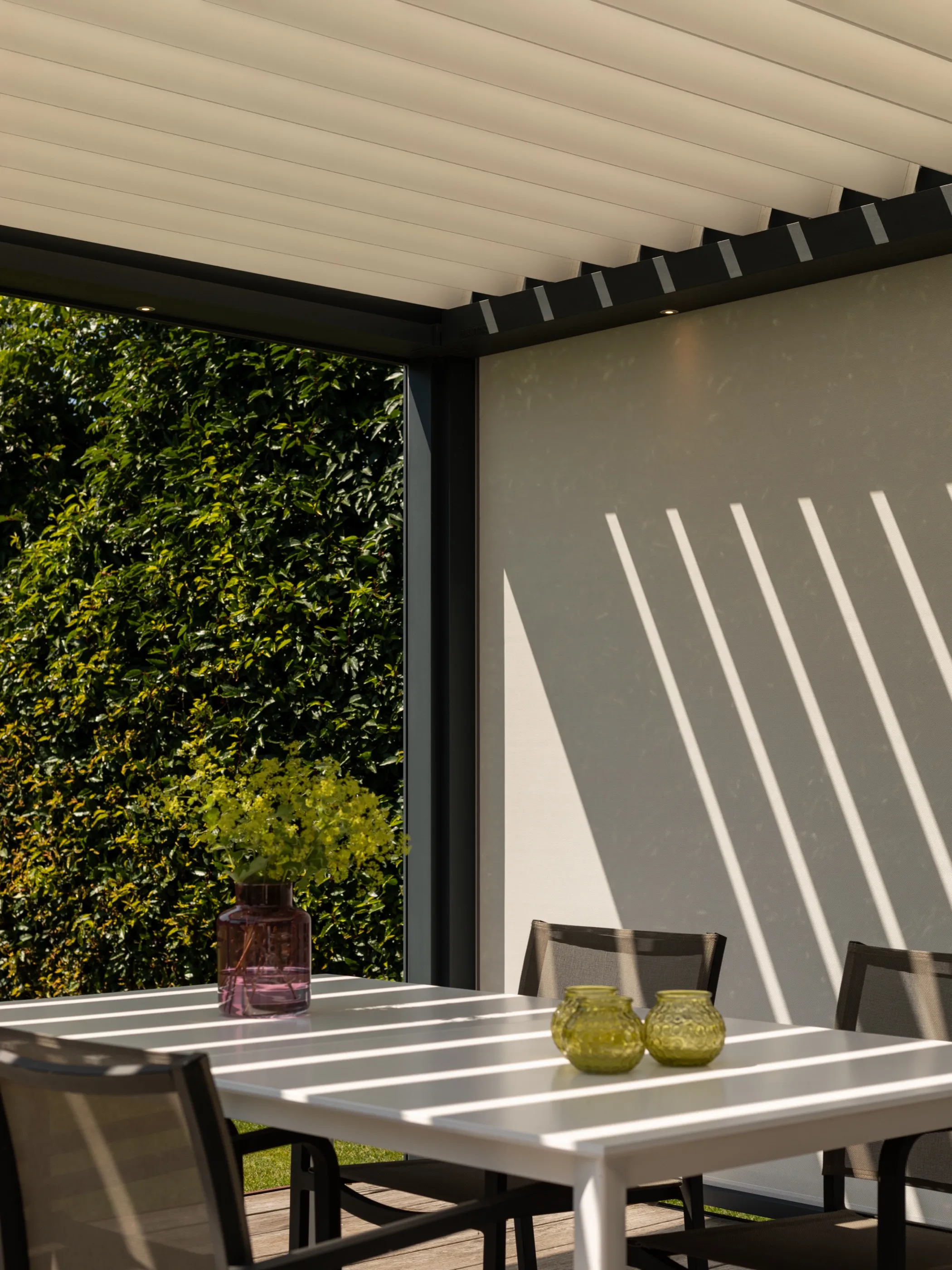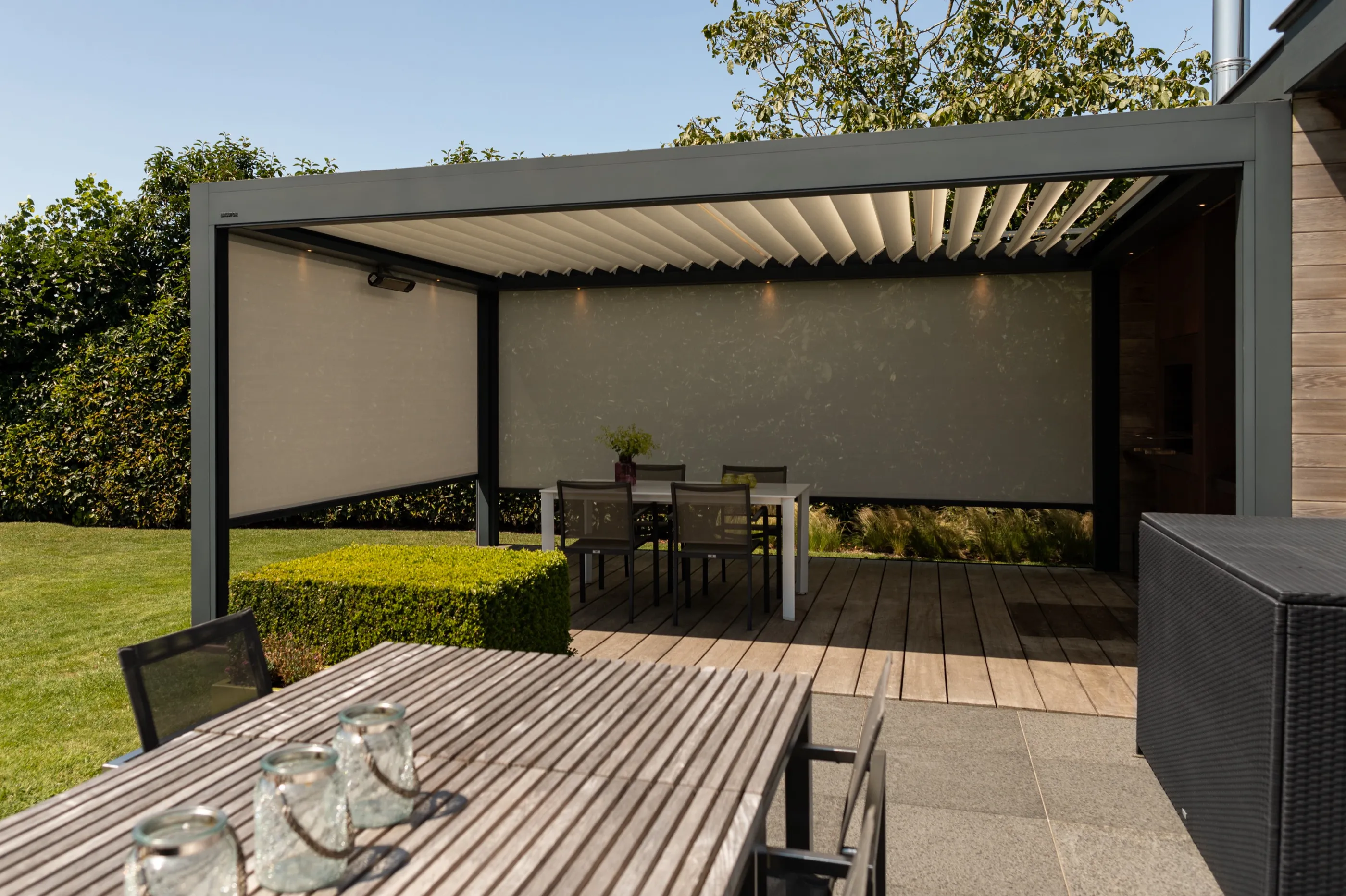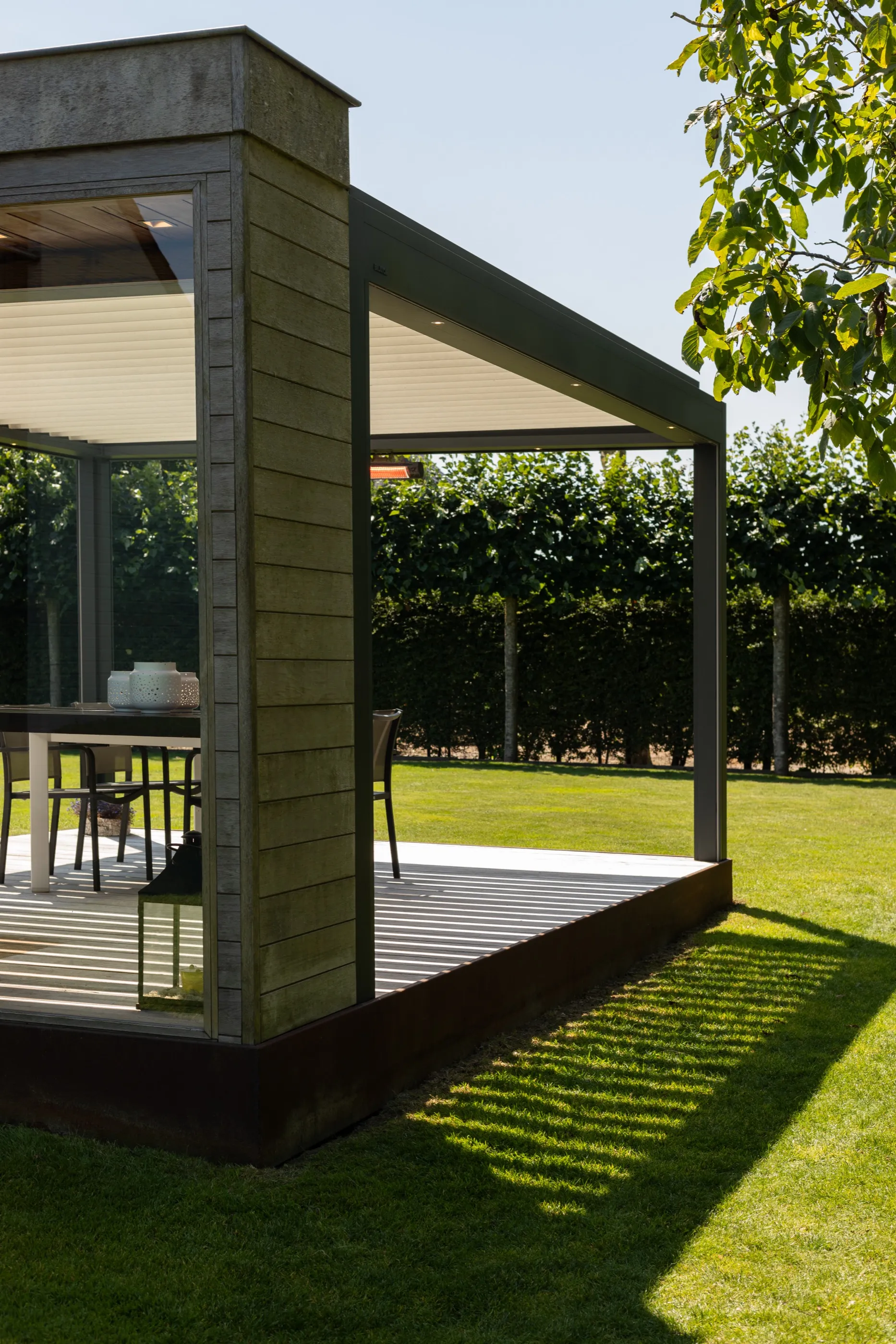 Großzügiges Lamellendach für eine weitläufige Terrasse mit Blick ins Grüne — maßgefertigt und nahtlos integriert in die moderne Architektur des Wohnhauses.