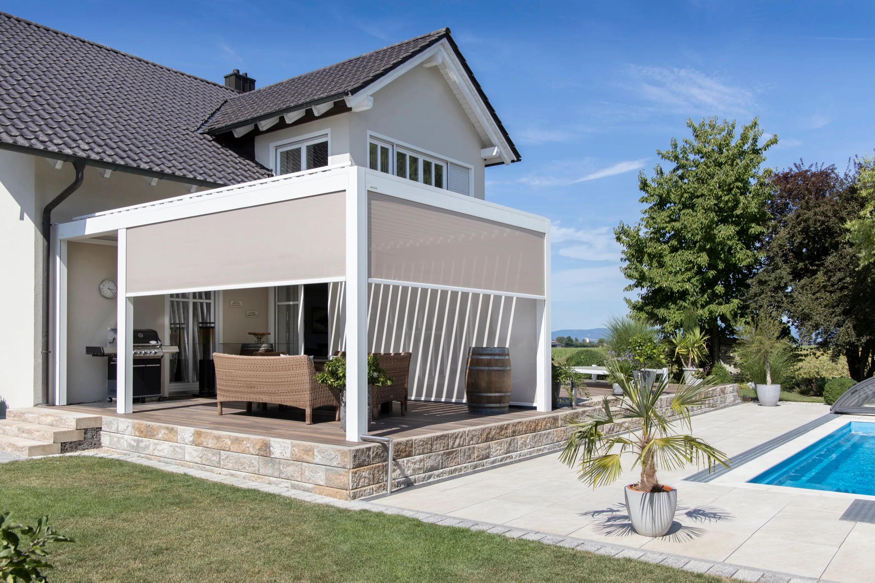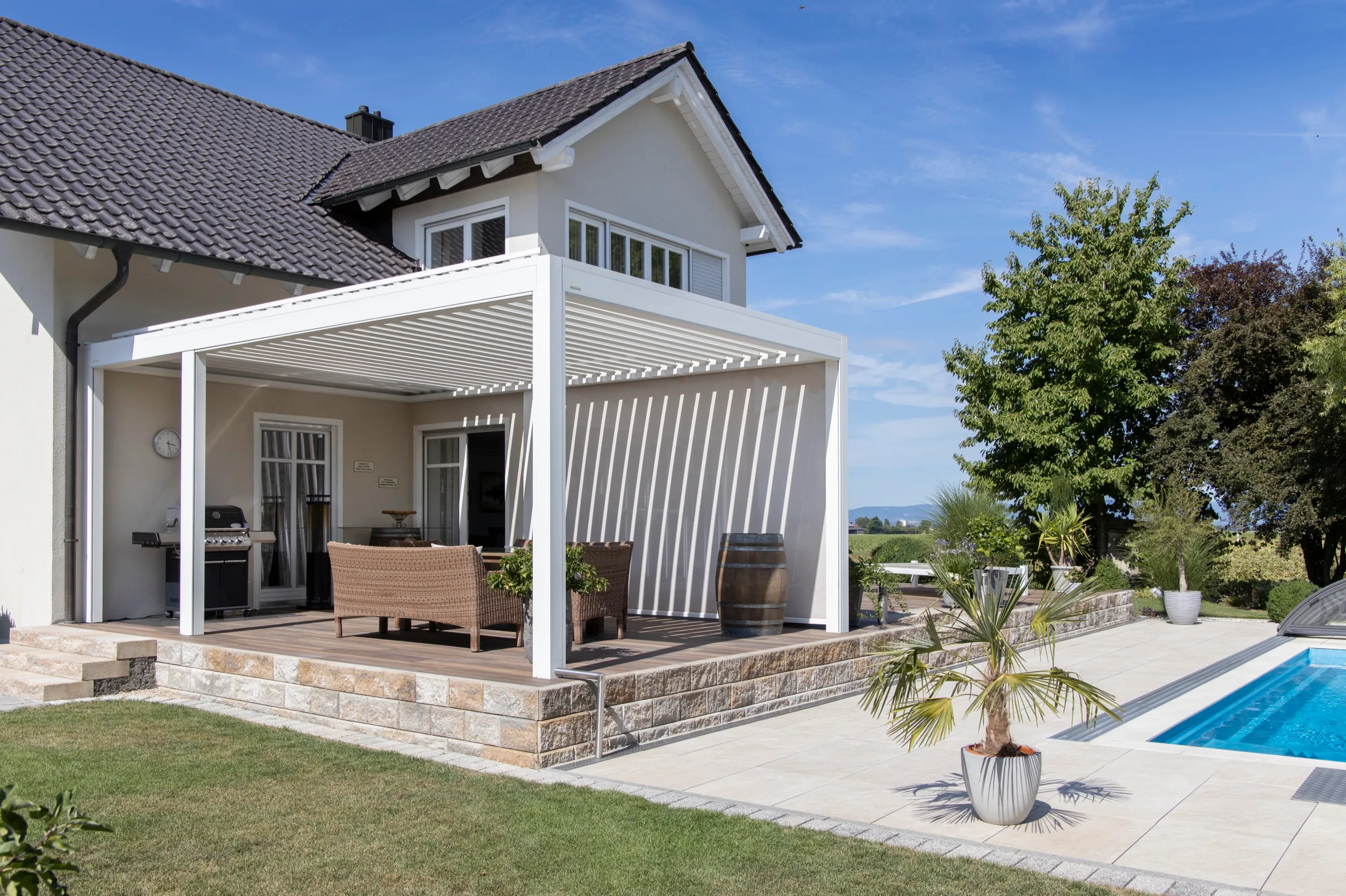 Lamellendach als verbindendes Element zwischen Haus und Garten — perfekt abgestimmt auf die Außenküche und den Loungebereich.