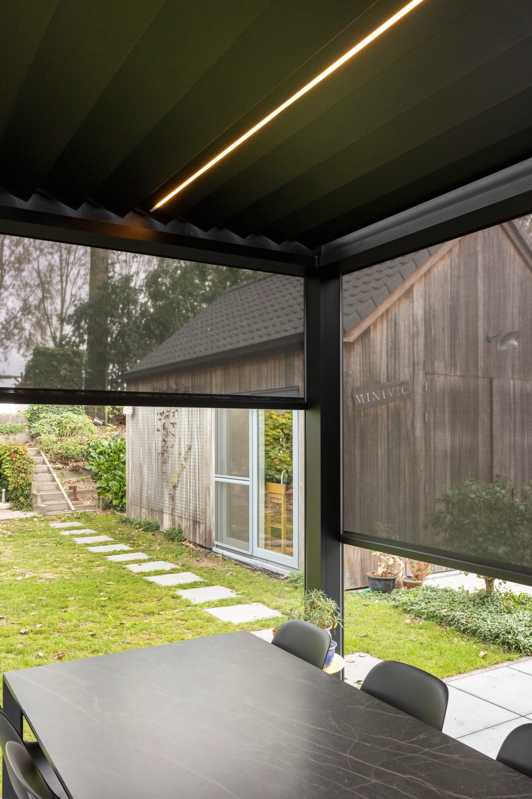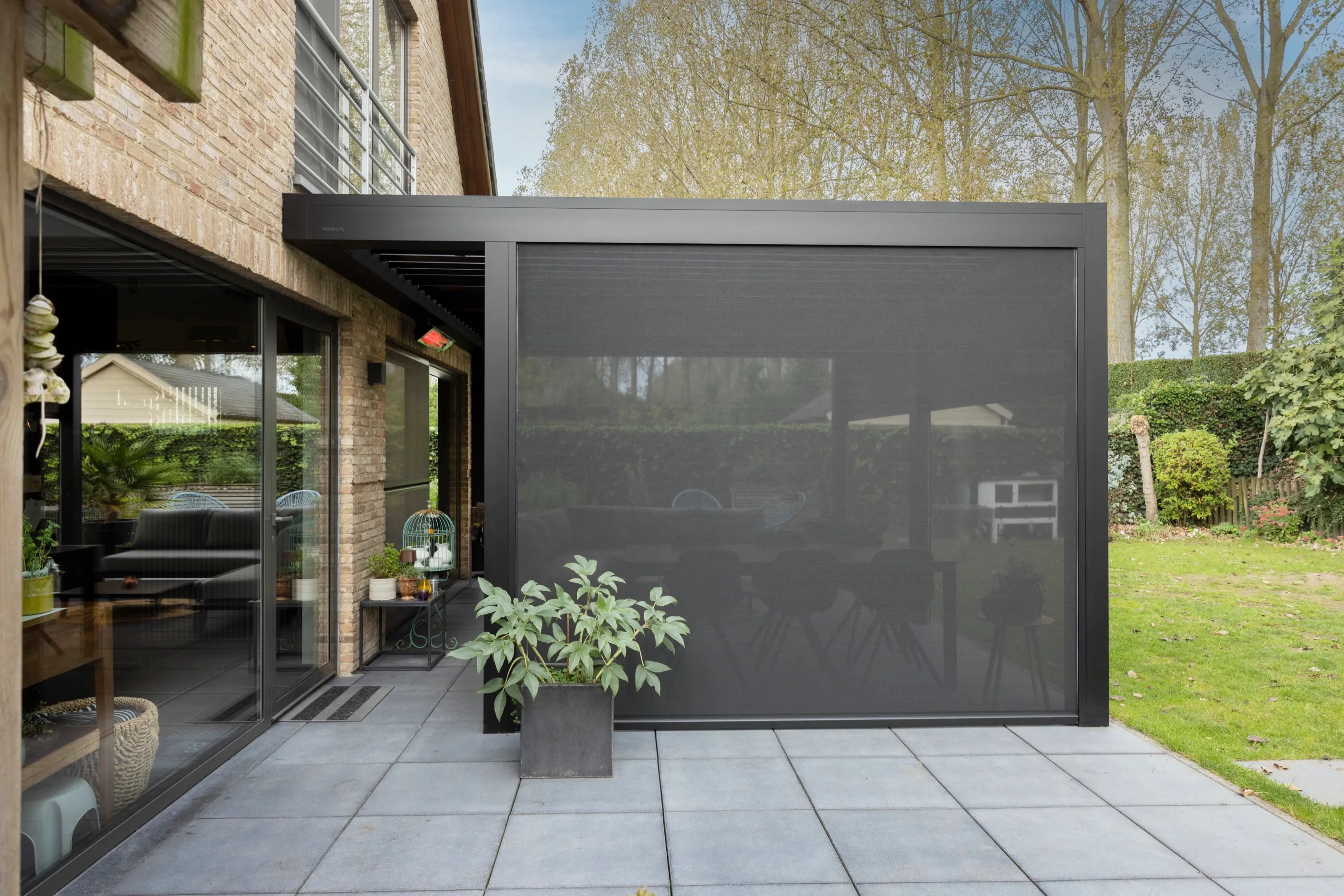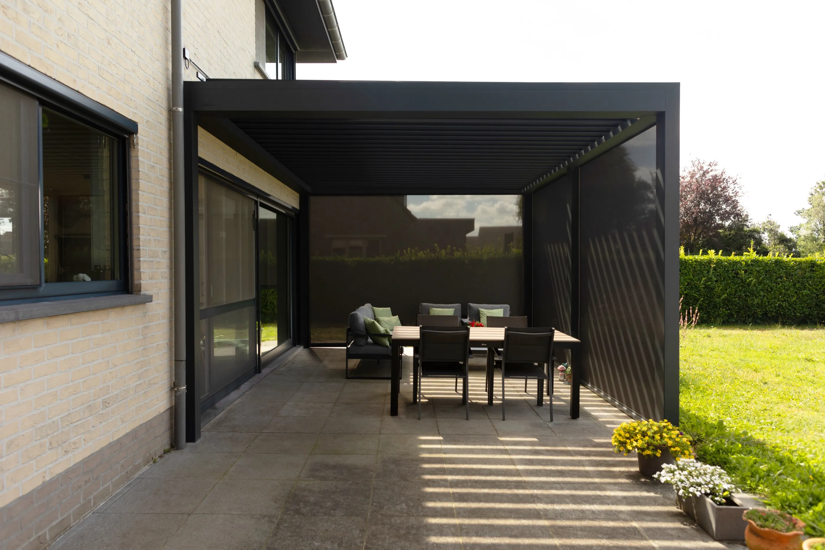 Zweite Ausbaustufe derselben Villa: ein freistehendes Lamellendach über dem Außenbereich, das Schatten und Regenschutz vereint.