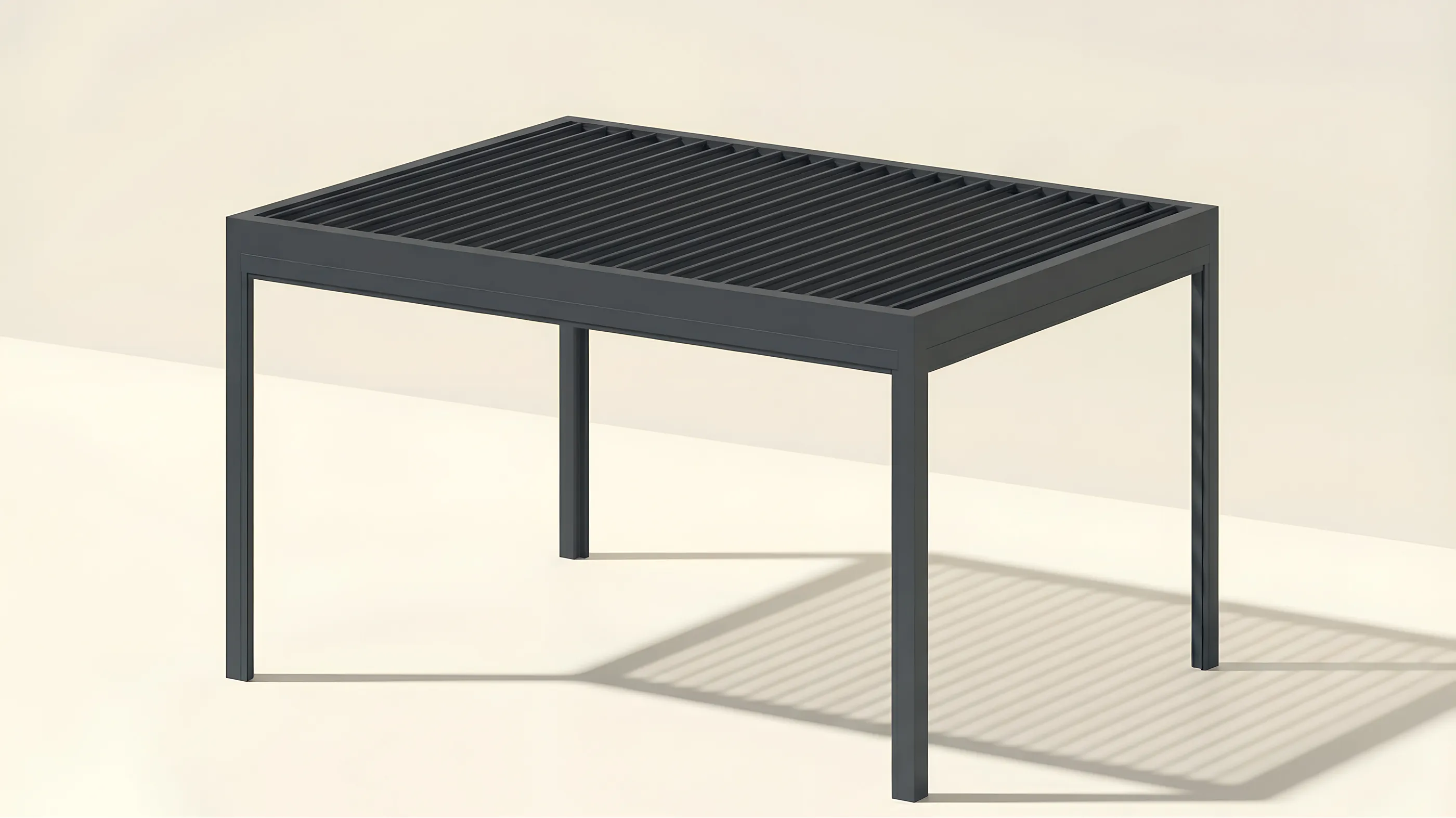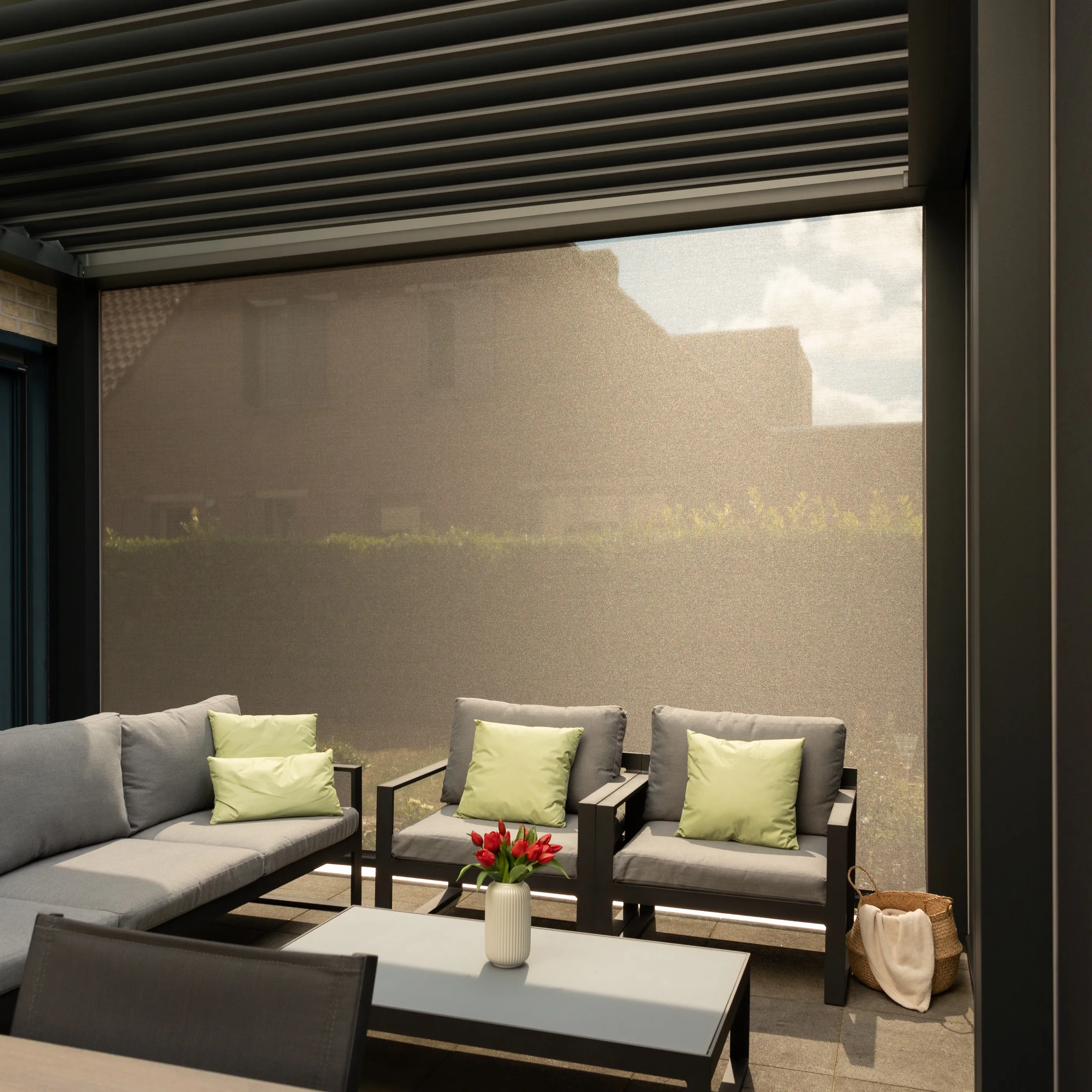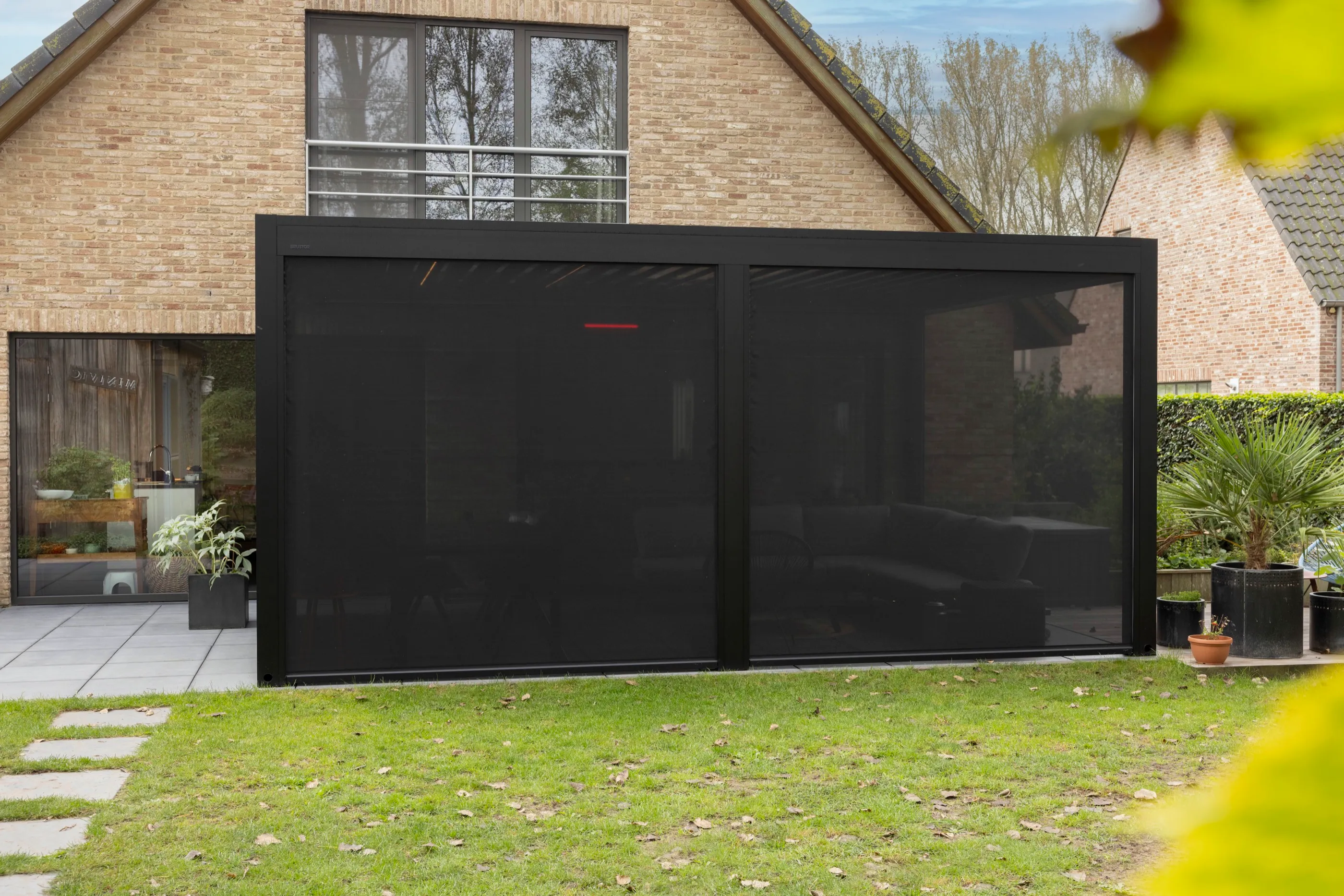 Zweite Ausbaustufe derselben Villa: ein freistehendes Lamellendach über dem Außenbereich, das Schatten und Regenschutz vereint.